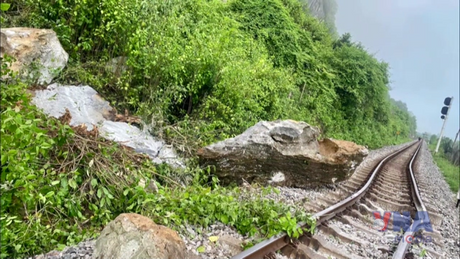 Đá lăn gây ách tắc đường sắt Bắc - Nam qua Quảng Trị
