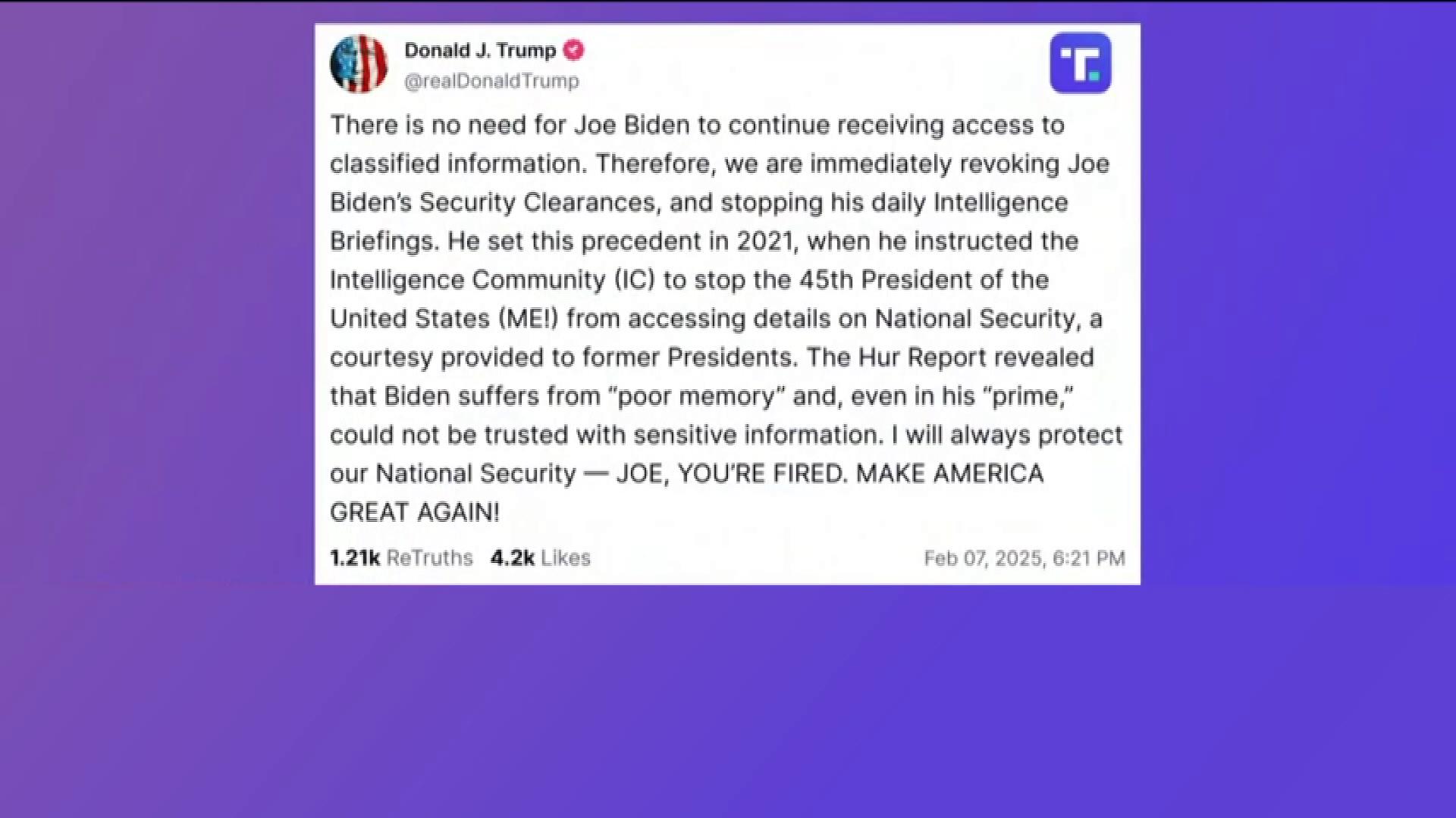 Cựu Tổng thống Mỹ bị tước quyền tiếp cận thông tin mật 08/02/2025 20:28 Cựu Tổng thống Mỹ bị tước quyền tiếp cận thông tin mật