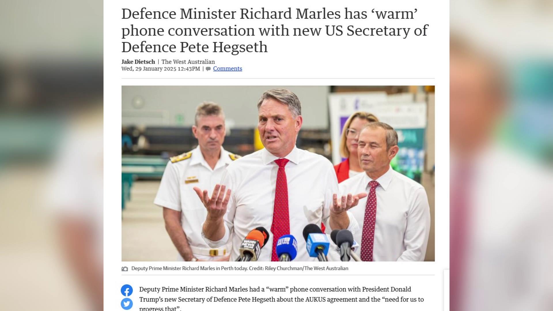 Australia coi trọng vai trò của Mỹ ở Ấn Độ Dương-Thái Bình Dương 29/01/2025 18:05 Australia coi trọng vai trò của Mỹ ở Ấn Độ Dương-Thái Bình Dương