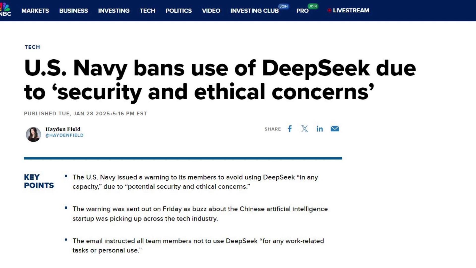 Hải quân Mỹ cấm nhân viên sử dụng DeepSeek 29/01/2025 18:14 Hải quân Mỹ cấm nhân viên sử dụng DeepSeek