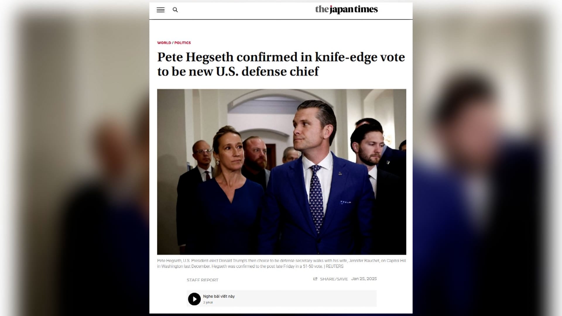 Thượng viện Mỹ phê chuẩn vị trí Bộ trưởng Quốc phòng 25/01/2025 18:22 Thượng viện Mỹ phê chuẩn vị trí Bộ trưởng Quốc phòng